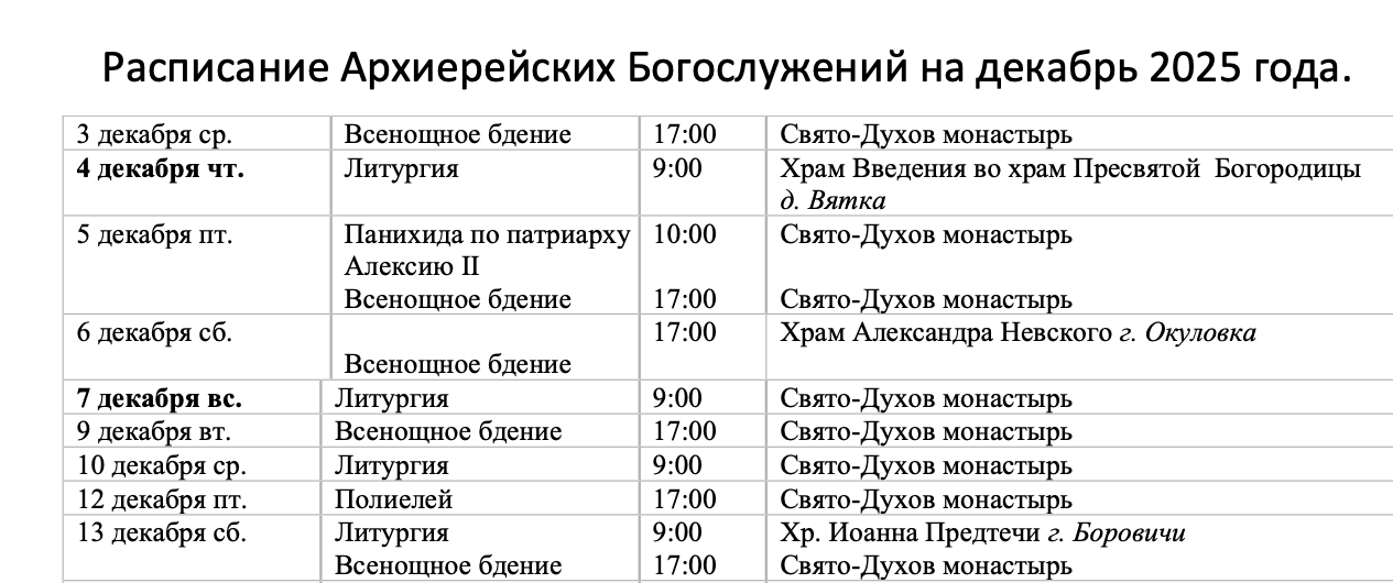 Расписание Архиерейских Богослужений на декабрь 2025 года. Читать далее