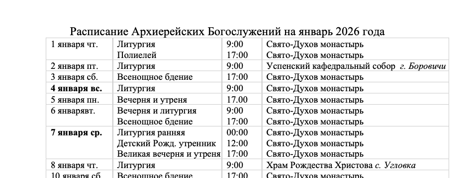 Расписание Архиерейских Богослужений на январь 2026 года. Читать далее