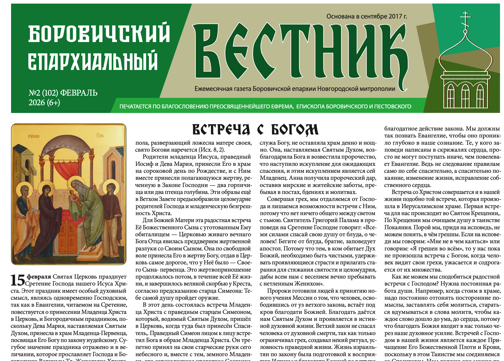 Вышел в свет новый выпуск газеты «Боровичский епархиальный вестник» за февраль 2026 год. Опубликовано 31.01.2026 pastordrugov Вышел в свет новый выпуск газеты «Боровичский епархиальный вестник» за февраль 2026 год. (14) Поделиться:TwitterВКонтактеGoogleОдноклассникиМой Мир